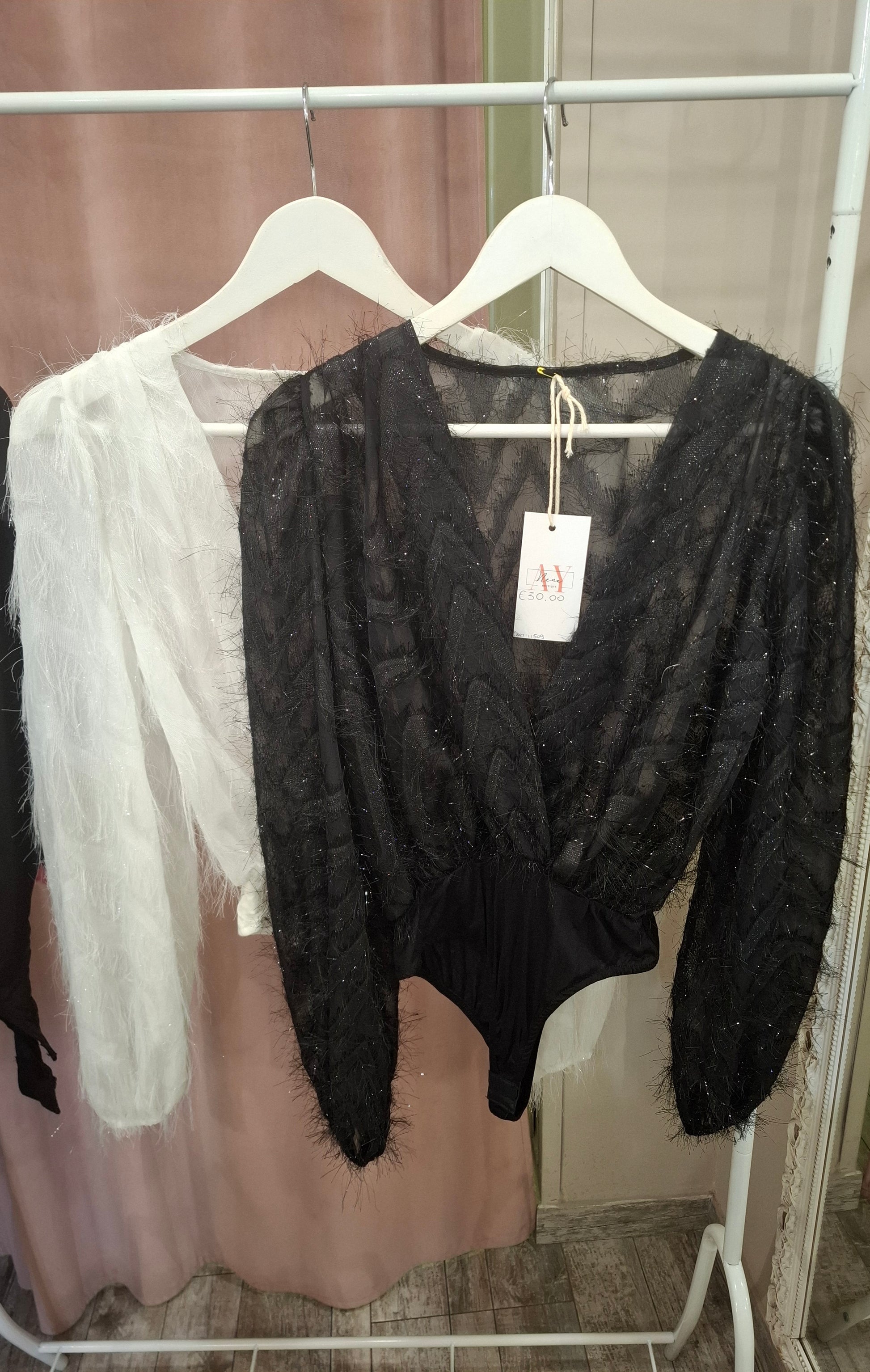 Body in tulle trasparente con dettagli effetto piuma e fili brillanti. Maniche lunghe leggermente a sbuffo e scollo a V profondo per un tocco elegante e sofisticato. Chiusura sul fondo con tessuto elasticizzato per un fit confortevole.
