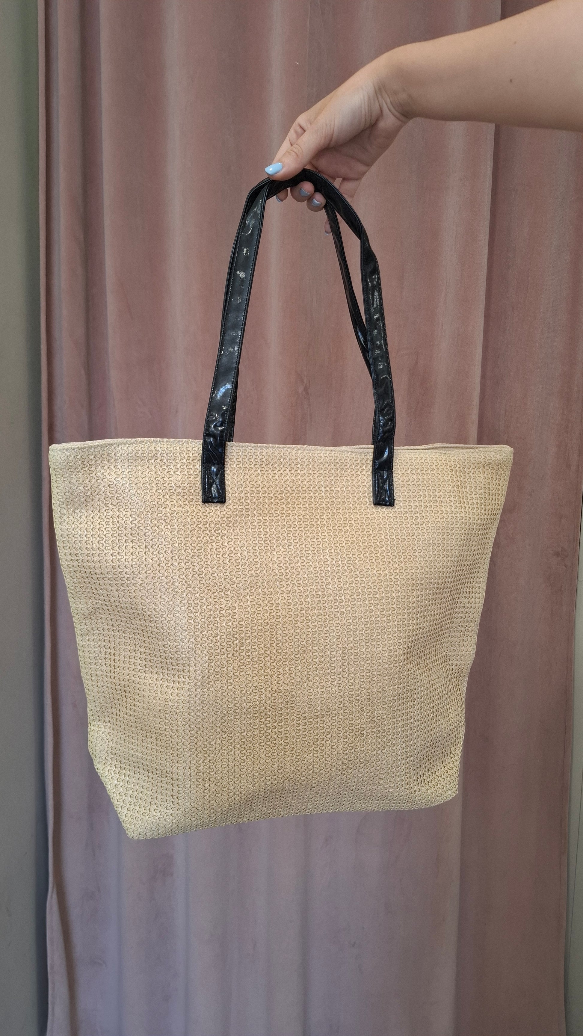 Questa borsa shopper in paglia è l’accessorio ideale per le giornate al mare o le passeggiate in città. I manici neri in ecopelle aggiungono un tocco moderno e versatile, facilmente abbinabile a ogni outfit.