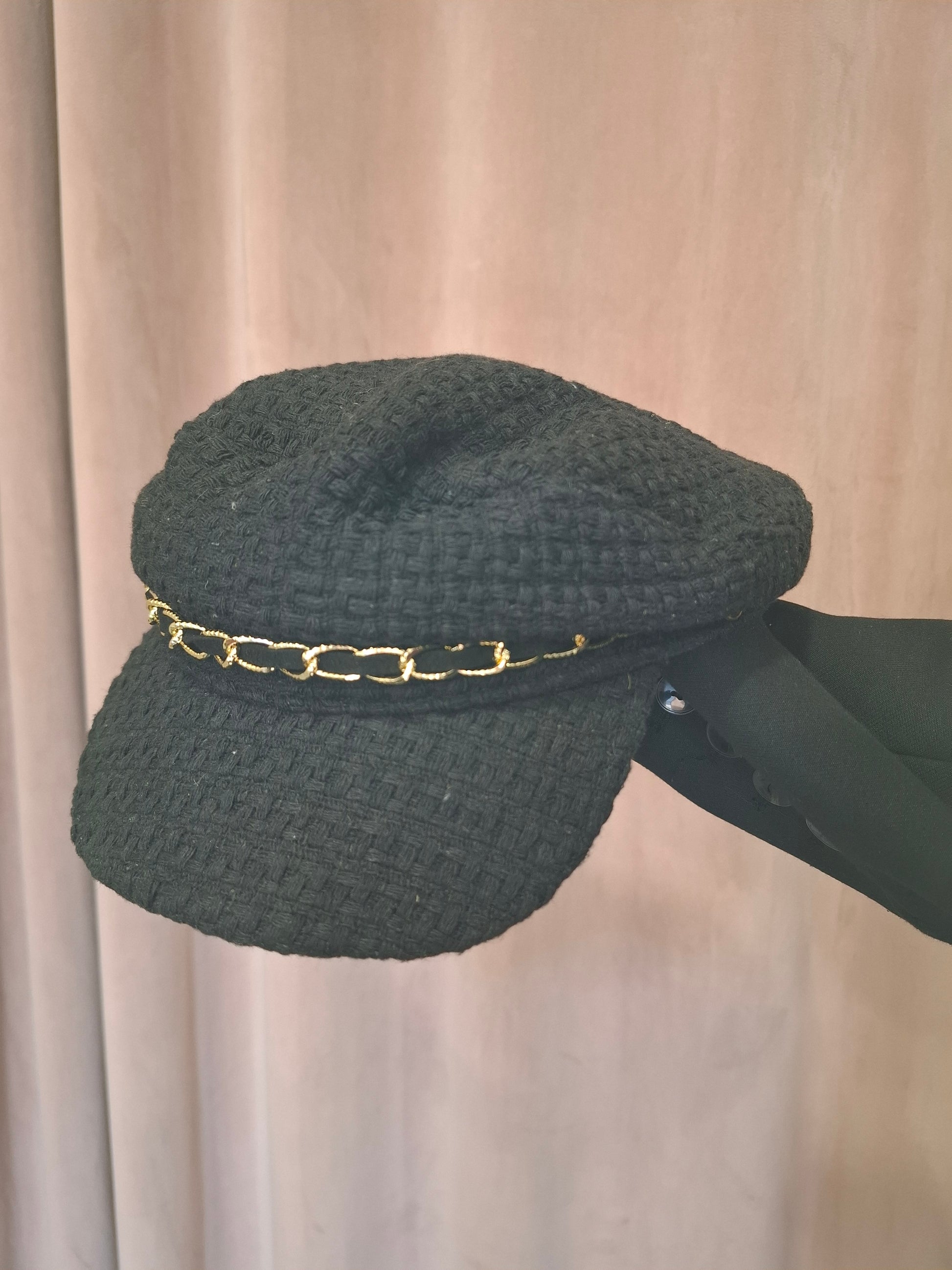 Un accessorio di tendenza per un look raffinato e deciso! Questo cappello baker boy è realizzato in tessuto intrecciato e arricchito da una catena dorata sul davanti, per un tocco glamour.
