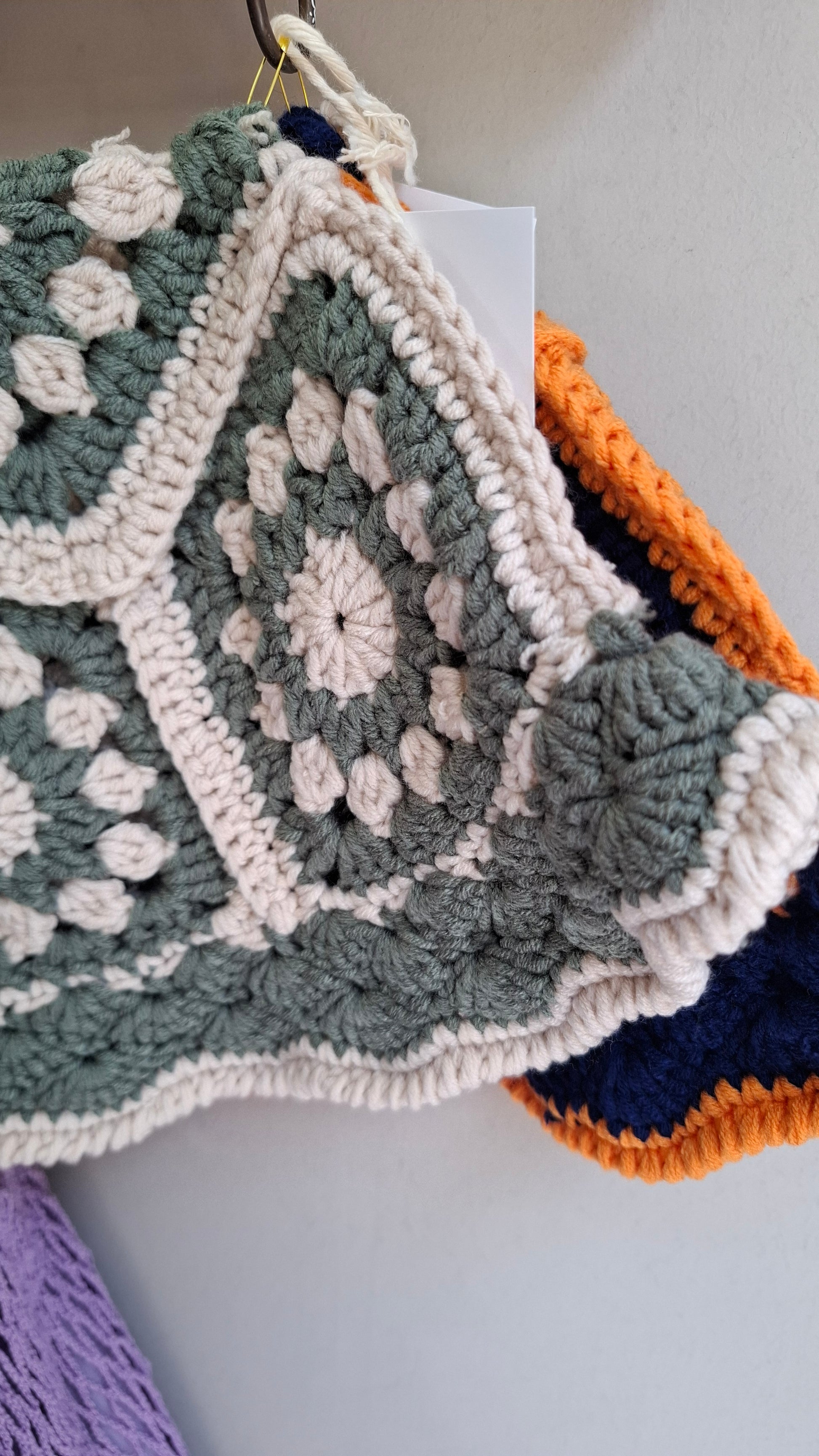 Dona un tocco boho e artigianale ai tuoi look con questo cappello all’uncinetto in fantasia verde salvia e panna. Realizzato in morbido cotone, ha una struttura flessibile e leggera, perfetta per le giornate estive.