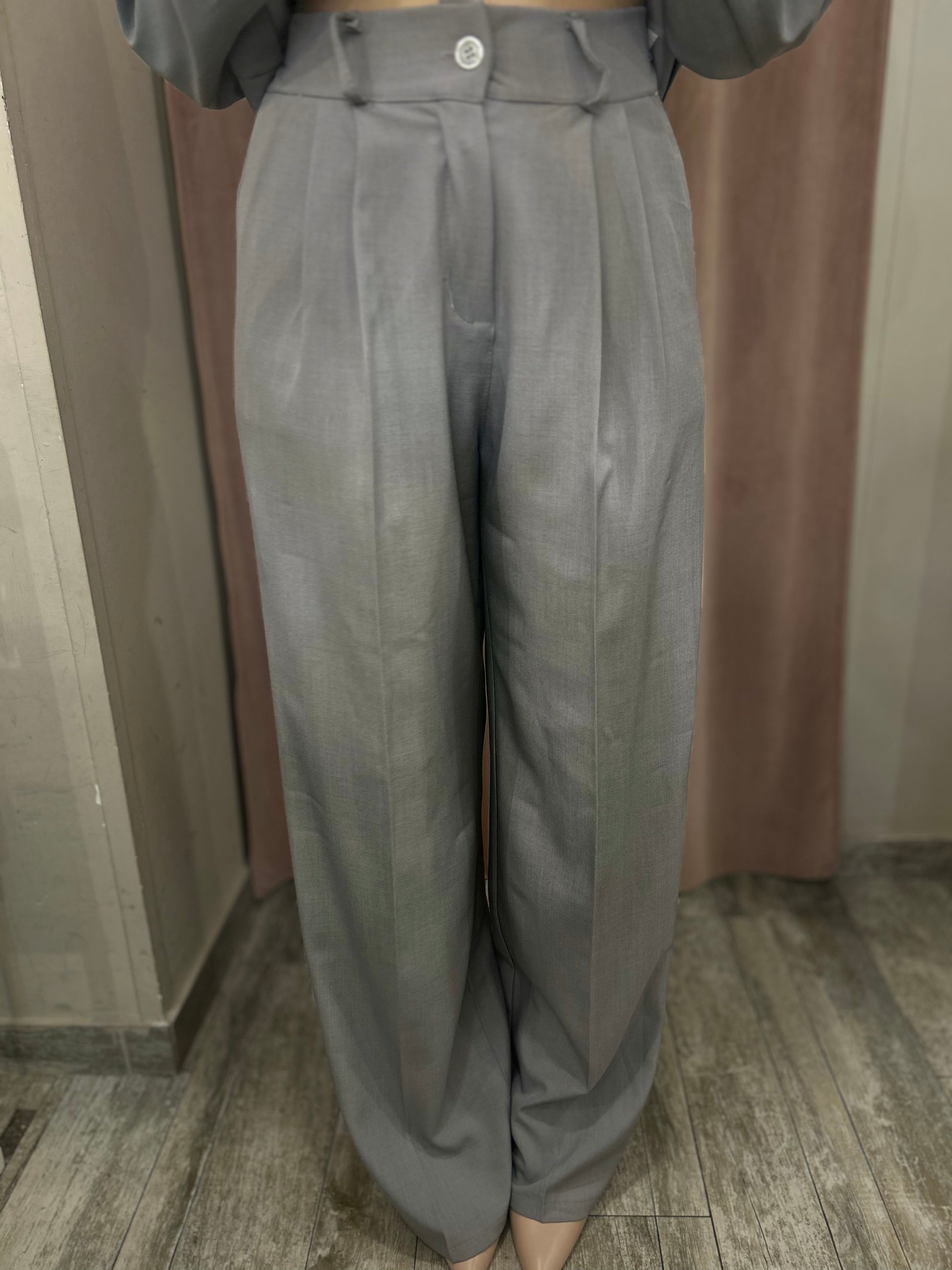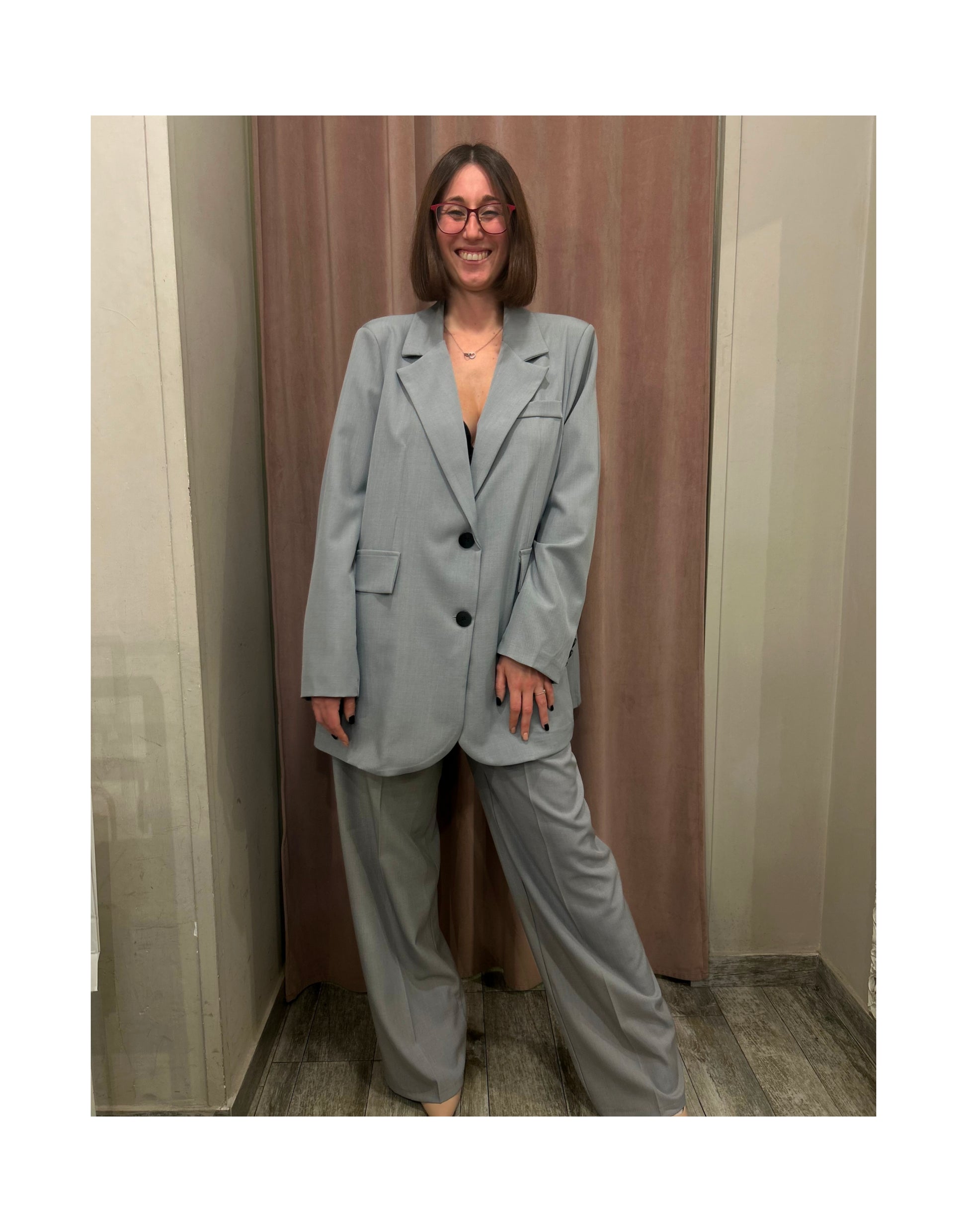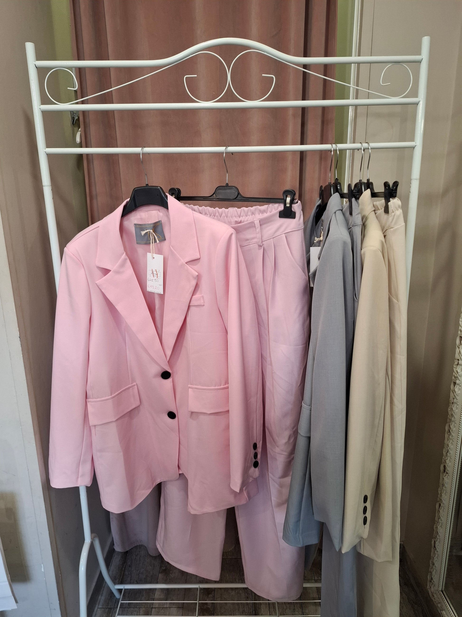 Un completo elegante e sofisticato composto da una giacca over dal taglio moderno e pantaloni a palazzo che slanciano la figura. Perfetto per un look da ufficio impeccabile o per occasioni speciali in cui vuoi distinguerti con classe. Versatile e di tendenza