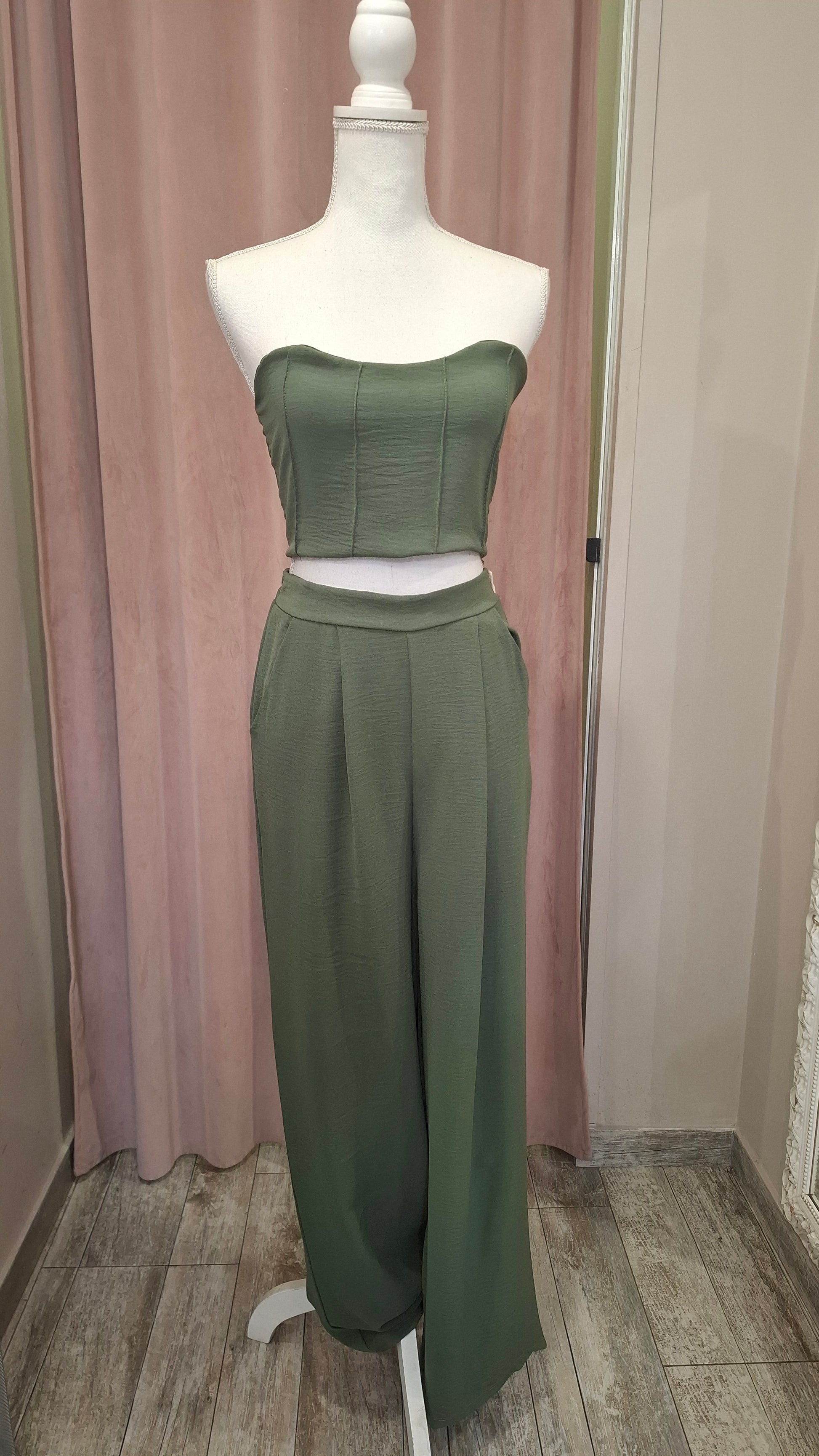 Questo completo è composto da due pezzi top a fascia e pantaloni a palazzo. Il top è senza spalline, aderente e corto, che lascia scoperto l'addome. I pantaloni sono lunghi e ampi, con una vestibilità morbida che scende dritta lungo la gamba, e tasche laterali.