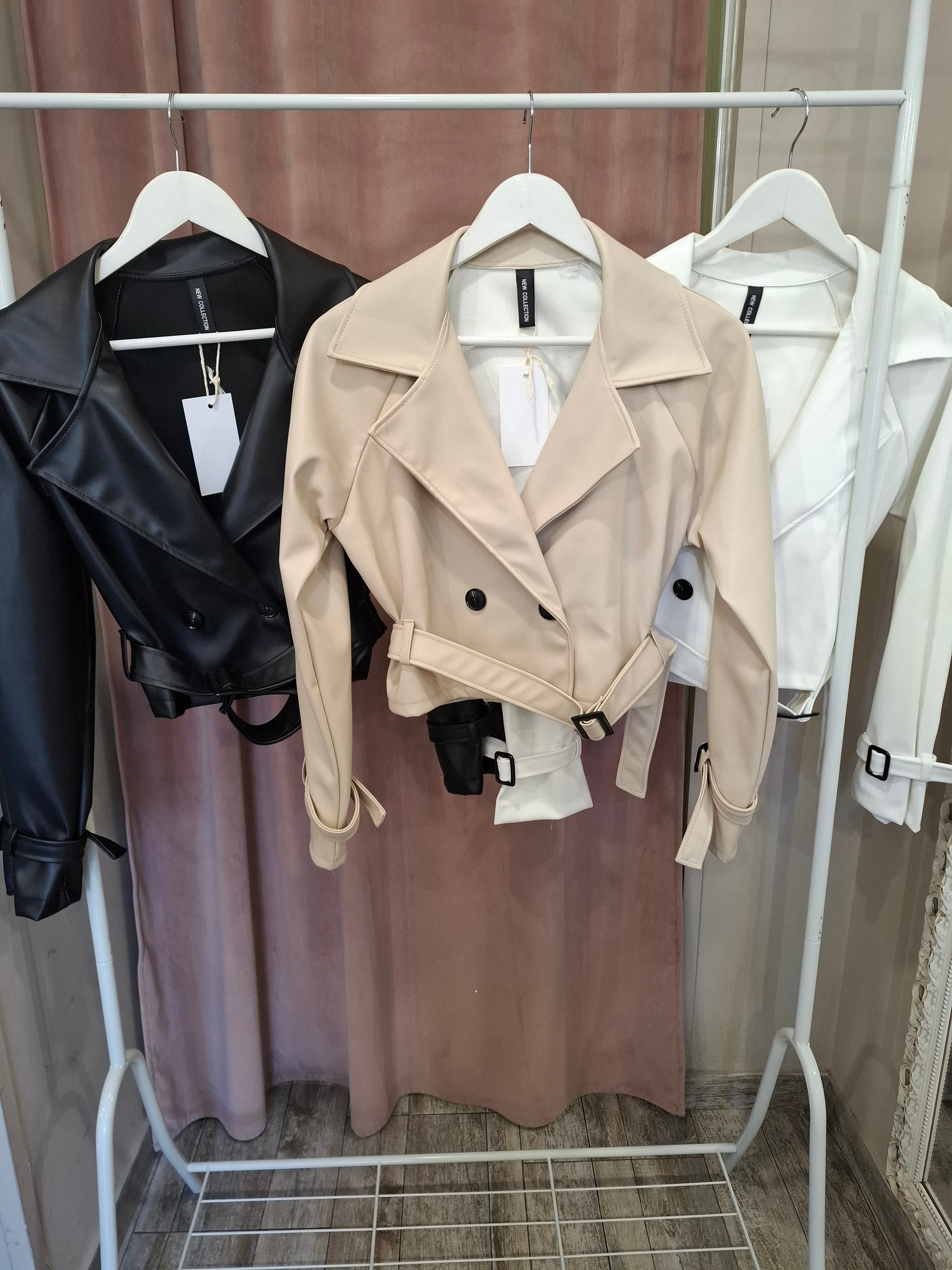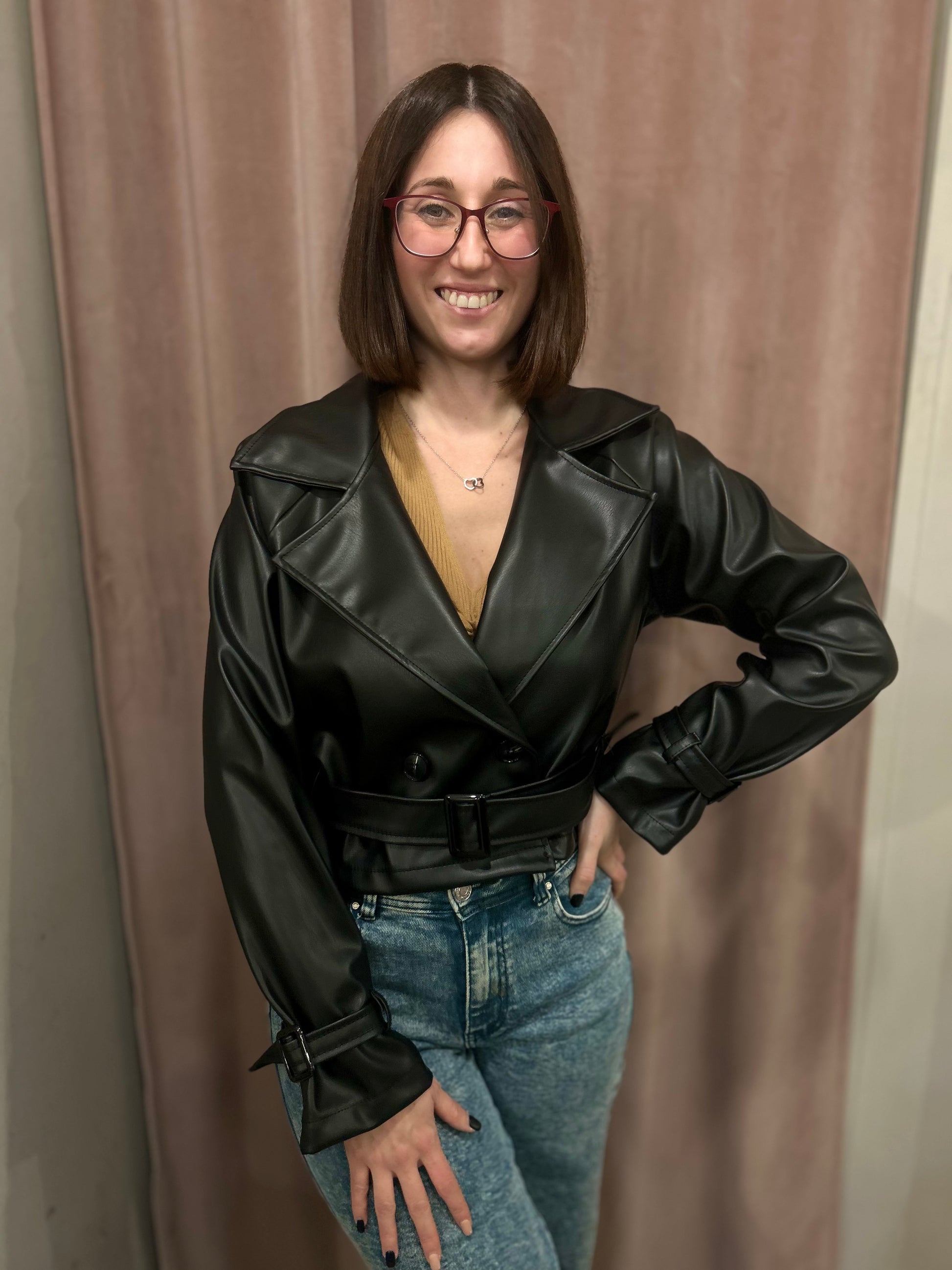 Giacca corta in ecopelle con cintura in vita per un fit valorizzato e cinturini sui polsini per un tocco di carattere.