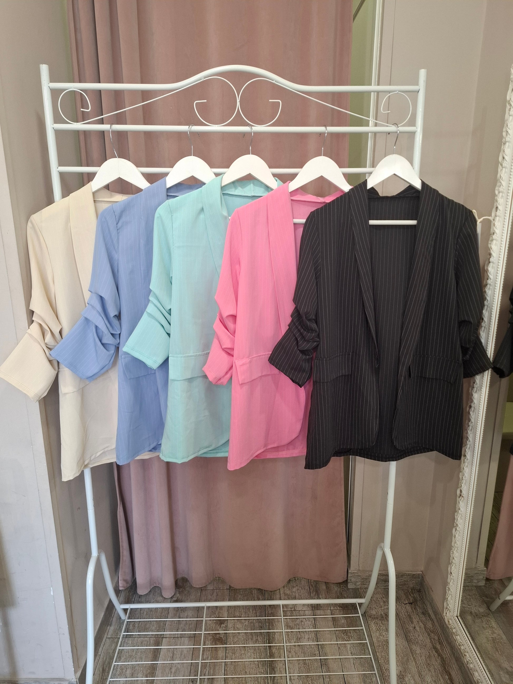 Un capo versatile e di tendenza, perfetto per completare qualsiasi outfit! Questo blazer leggero ha un design morbido, senza bottoni, con maniche arricciate per un tocco casual chic. Ideale sia per il giorno che per la sera