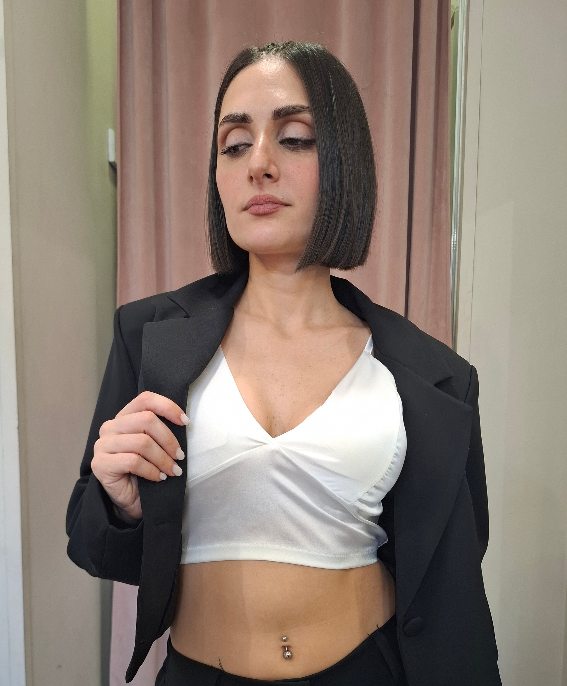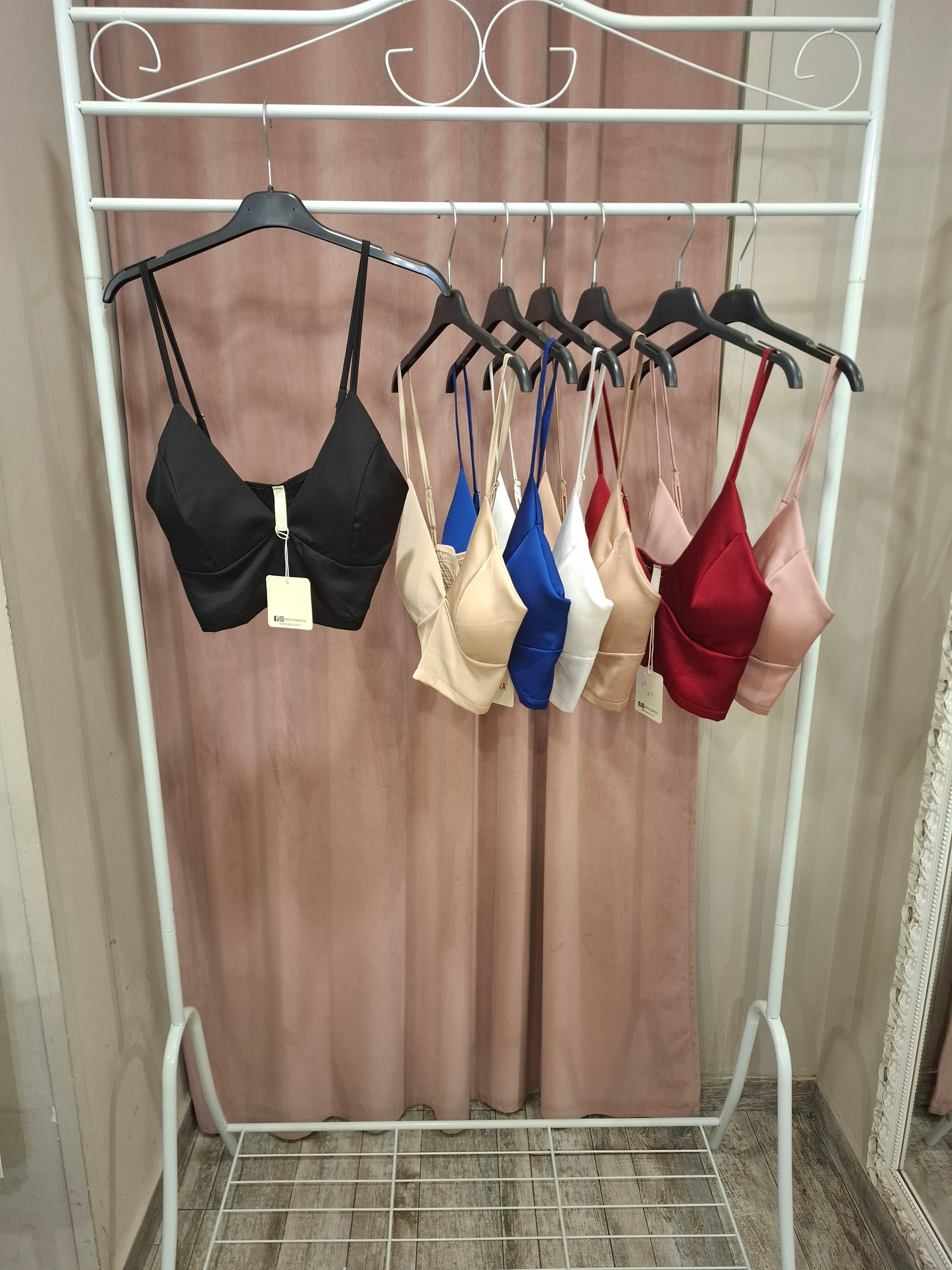 Top satinato con bretelle regolabili: eleganza e comfort in un unico capo. Il tessuto satinato dona un tocco luminoso e raffinato, mentre le bretelle regolabili assicurano una vestibilità perfetta