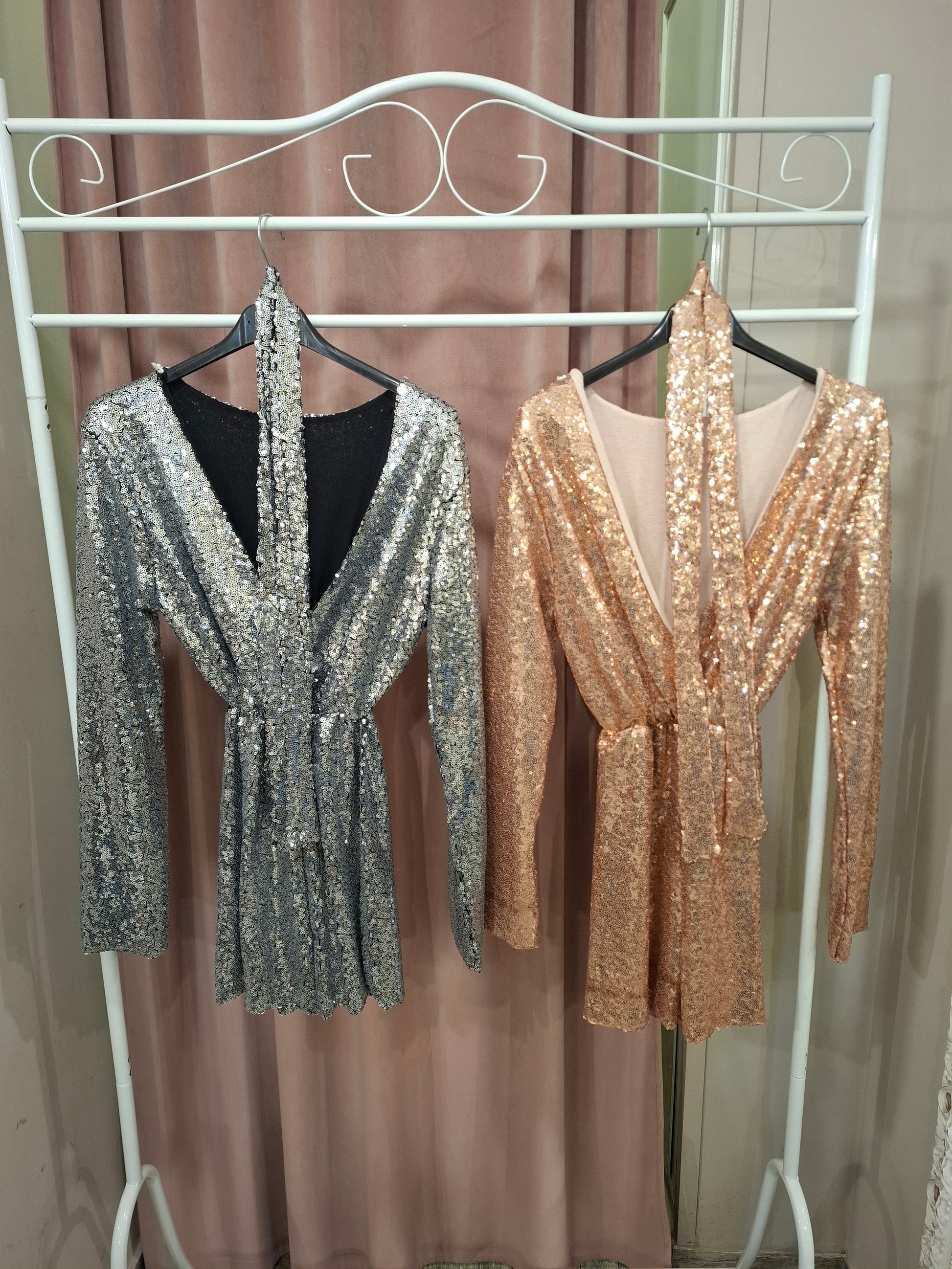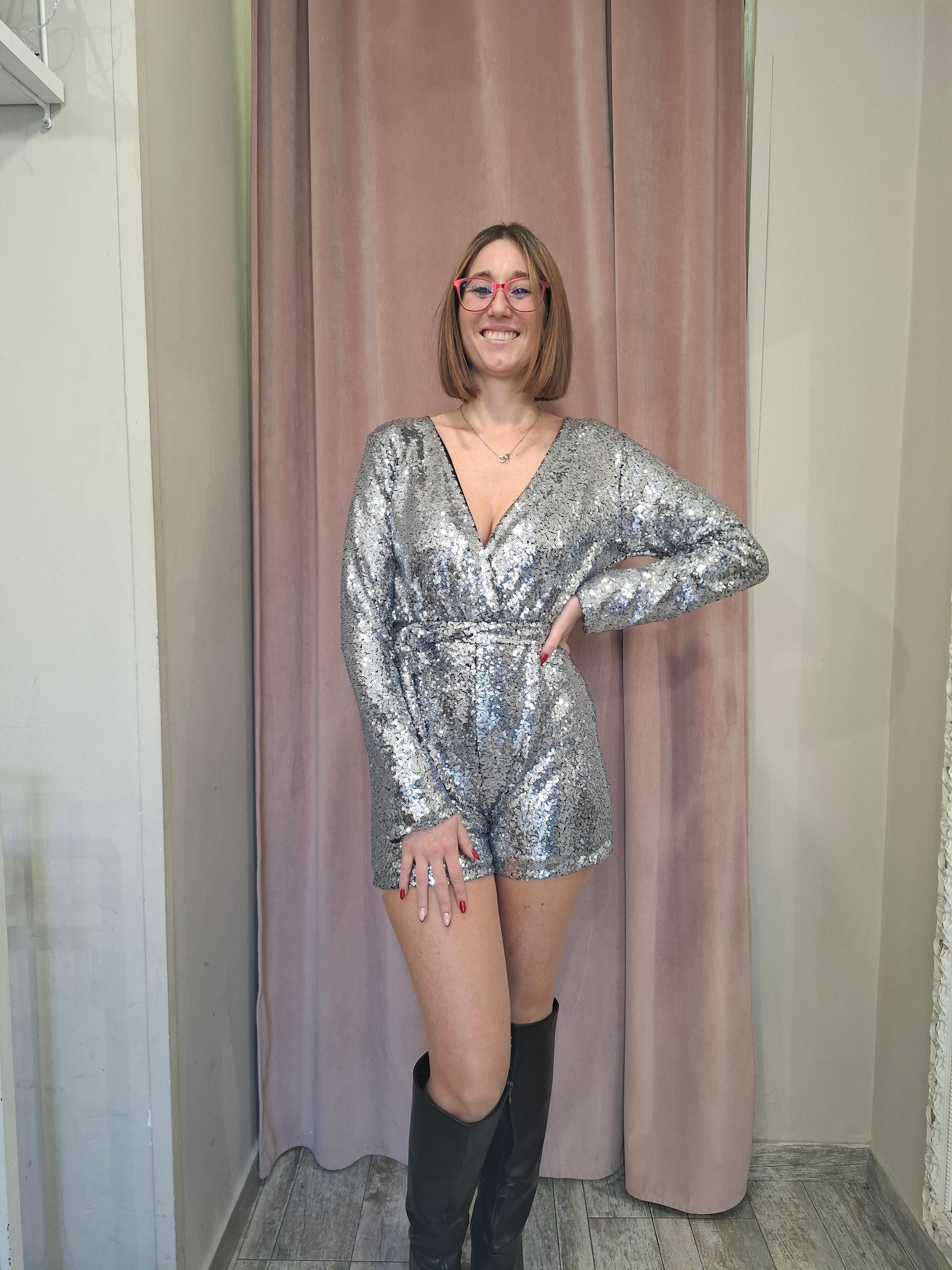 Tutina a pantaloncino brillantinata con cintura: un capo glamour e di tendenza. Il tessuto scintillante e la cintura in vita valorizzano la silhouette, creando un look perfetto.
