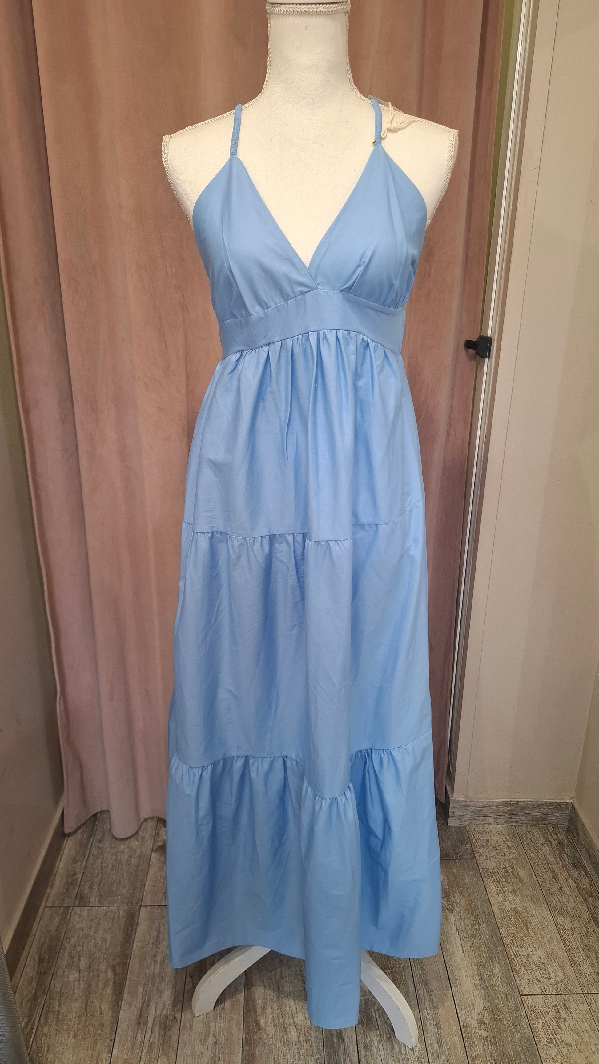Questo abito lungo è l’emblema della freschezza estiva. Realizzato in morbido cotone leggero, è perfetto per le giornate più calde. Il design presenta uno scollo a V profondo e un elegante corpetto con taglio impero che valorizza il décolleté senza costringere. Le spalline sottili si incrociano sulla schiena, lasciandola in gran parte scoperta per un effetto raffinato e femminile. La gonna è ampia, con balze leggere che donano movimento e comfort. Ideale per una passeggiata sul lungomare o per un evento all'aperto.